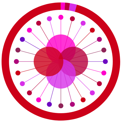 In this visualization, the outer ring segments show the relative proportions of its four prime factors. Inside, the large and small discs symbolize the relationship between these factors (center) and twenty-four divisors.